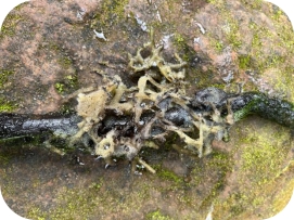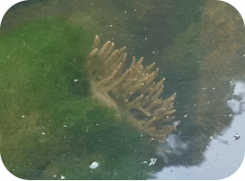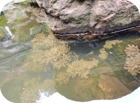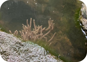图6 附着在石头青苔上的海绵动物 图7 生长于水中腐木的海绵动物