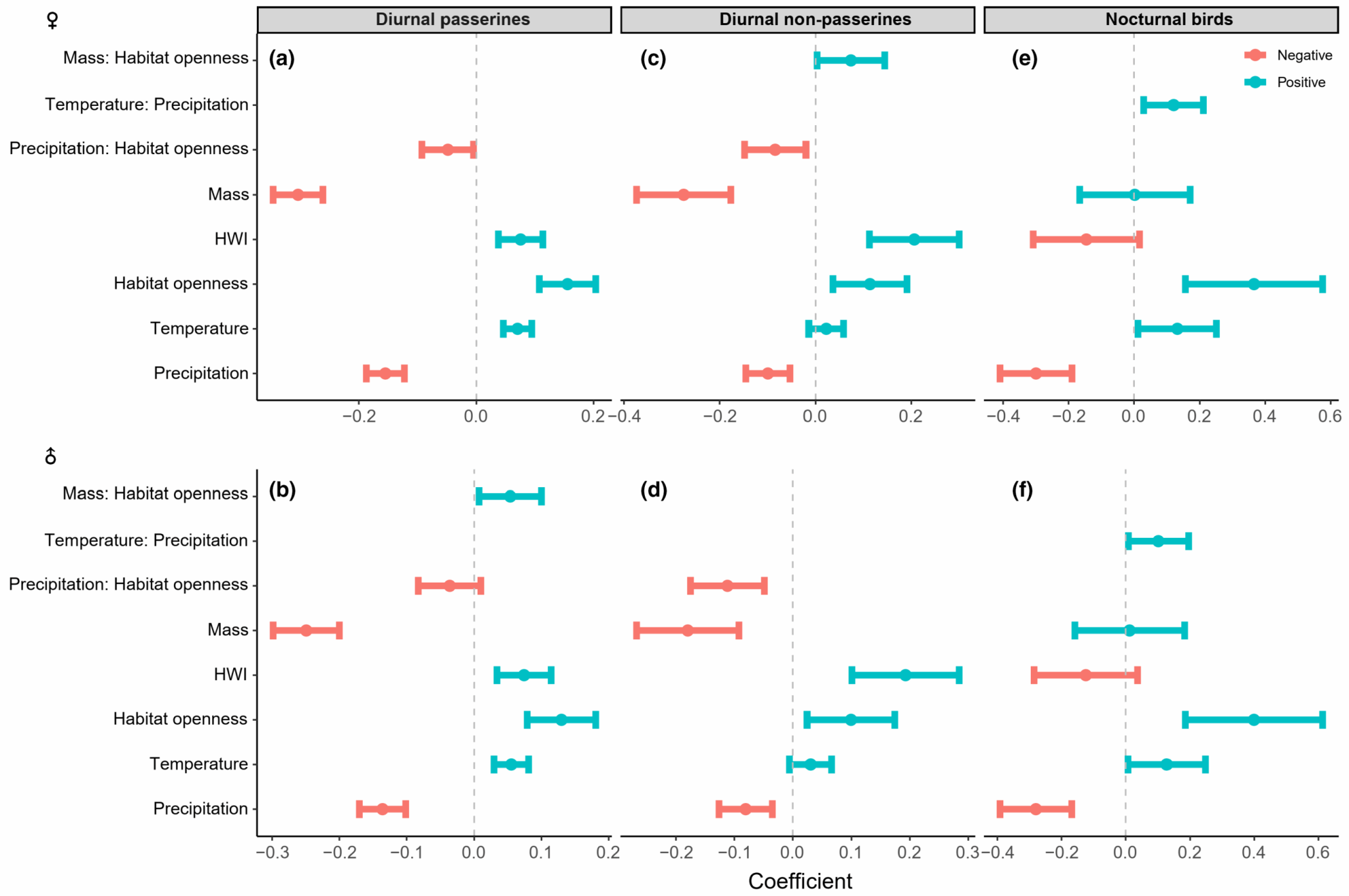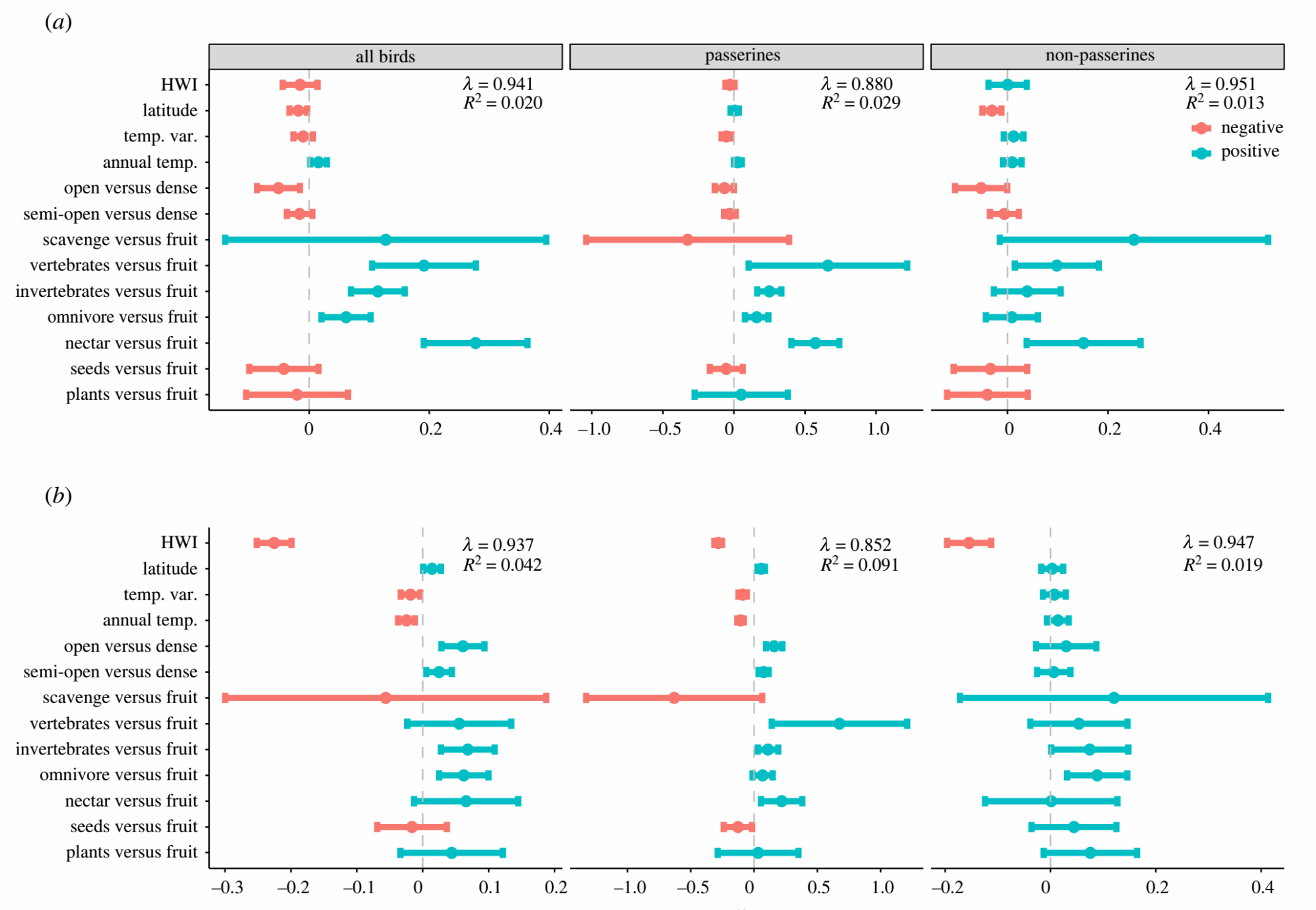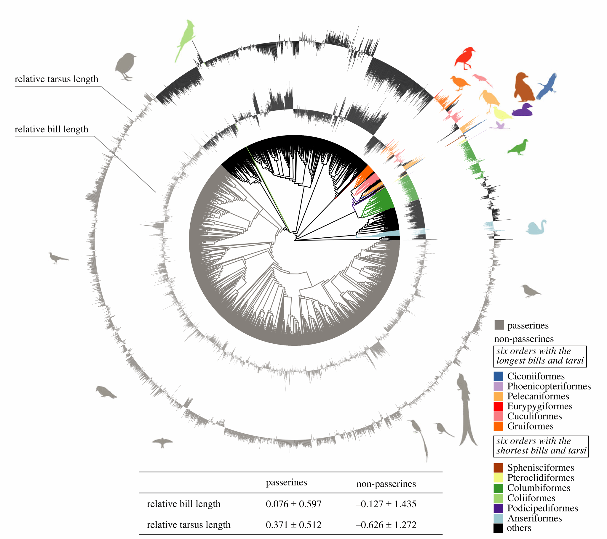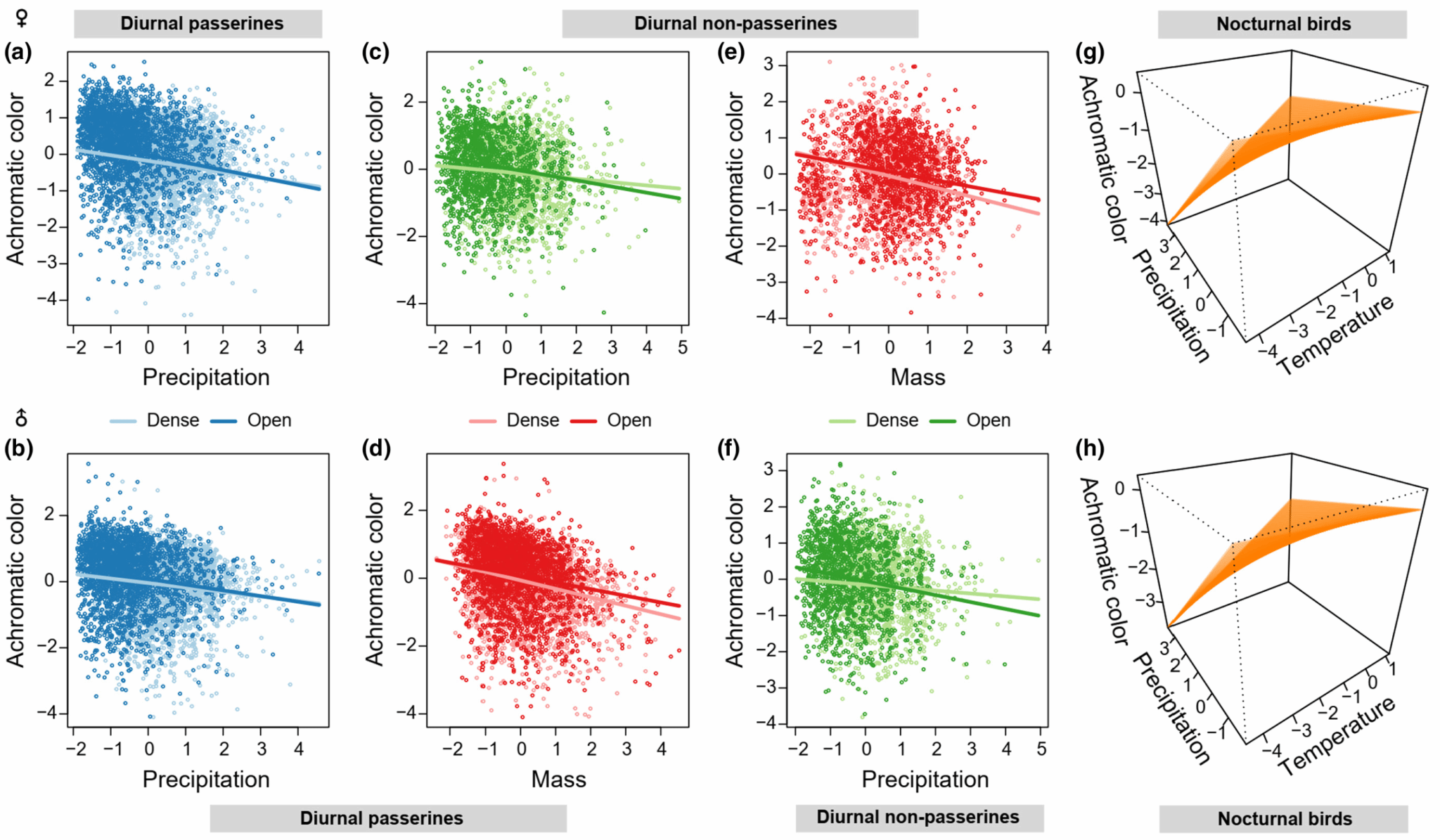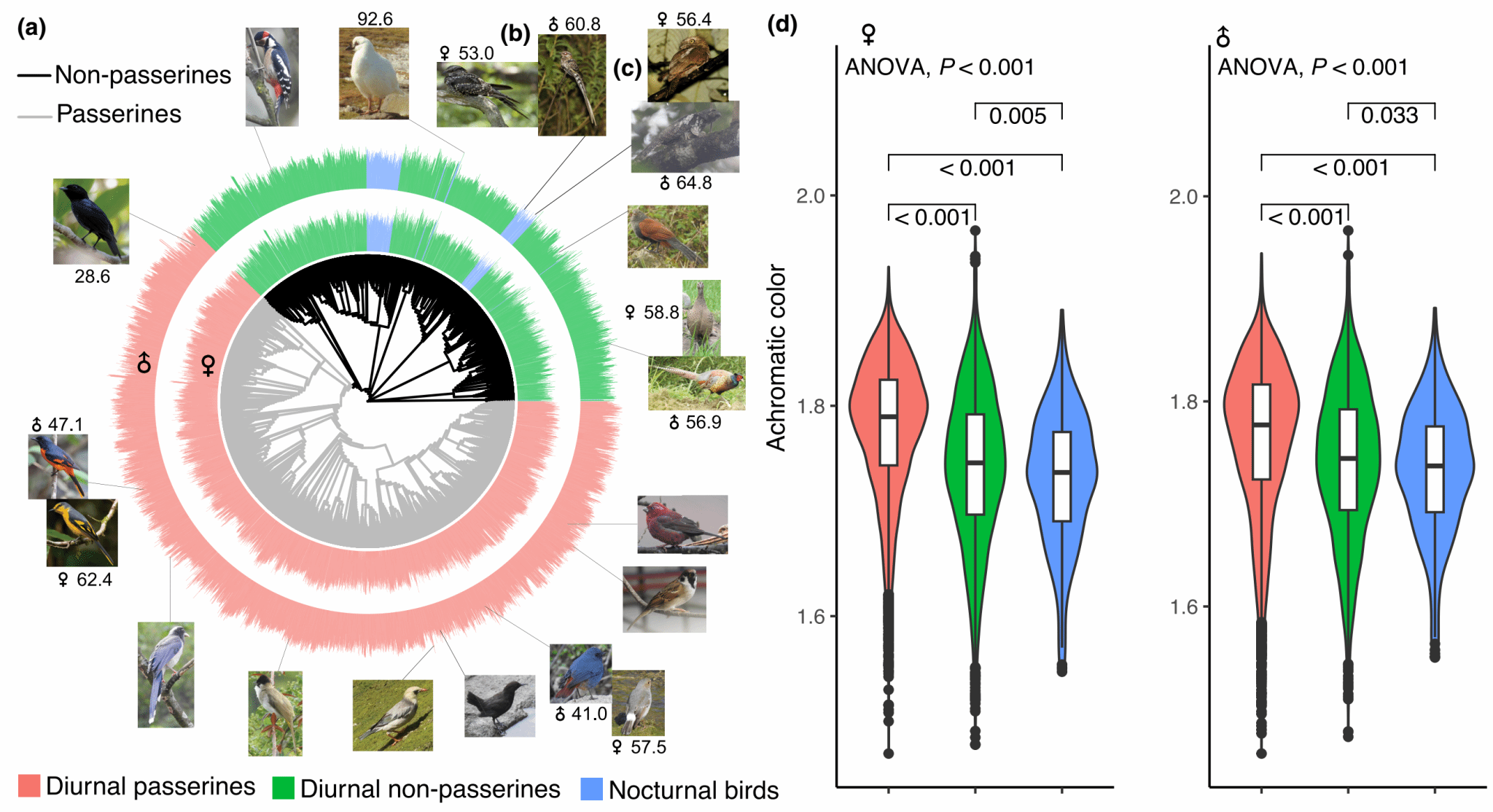 全球有超过10000种鸟类,为什么有的鸟类喙长、有的喙短,有的腿长、有的腿短,有的羽色深,有的羽色浅?这些问题自达尔文时期以来,一直吸引着进化生物学与生态学学者的关注,但对其形成机制的认识依然充满挑战。上述两项研究以全球非迁徙性鸟类为对象,运用系统发育线性回归和系统发育路径分析,在控制物种间系统发育关系及因子间直接与间接关系的前提下,检验相关假说。研究揭示了鸟类喙长和跗跖(即裸露的腿部)长的变化如何适应觅食、体温调节和飞行性能等功能及其权衡,以及羽色深浅变化如何适应体温调节、隐蔽、信号传递、防水及抗菌等功能及其权衡。这些发现为深入理解鸟类如何适应环境与进化提供了重要证据。