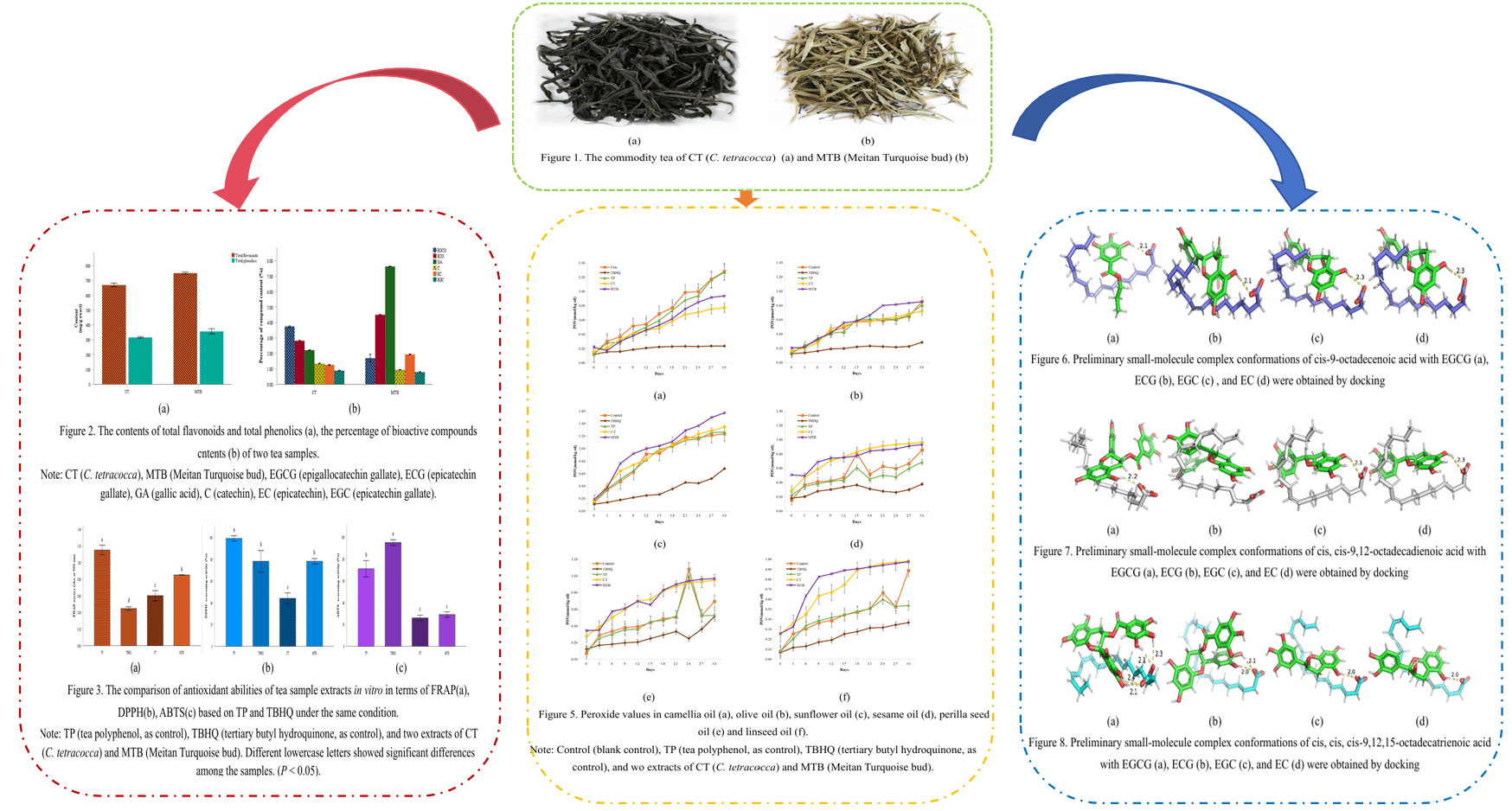 四球茶和湄潭翠芽是贵州各具特色两个茶业品种,因其丰富的多酚类和黄酮类化合物而具有极高的抗氧化潜力。研究团队采用多种体外抗氧化模型(如FRAP、DPPH和ABTS)以及脂质过氧化抑制实验模型评估两种茶叶提取物在植物油中的抗氧化效果,结果表明,相较于四球茶,湄潭翠芽提取物在抗氧化活性方面表现更为优异,特别是在油脂氧化的初期阶段。然而,在油酸含量较高的油脂(如山茶油和橄榄油)中,四球茶提取物在氧化晚期的抑制效果显著优于湄潭翠芽。本研究不仅揭示了两种茶叶提取物在不同油脂体系中的抗氧化差异,还通过分子对接研究了其主要活性成分与脂肪酸之间的结合能量,进一步解释了其抗氧化效果的作用机制。这一研究为探索茶叶在天然植物油脂抗氧化剂领域的应用奠定了坚实的基础,并为食品工业开发更安全、高效的植物油脂抗氧化剂提供了新思路。