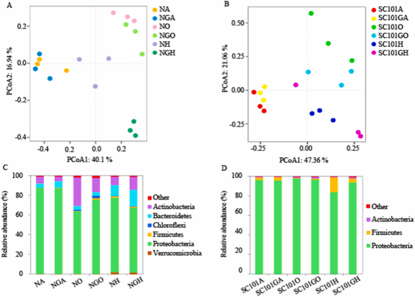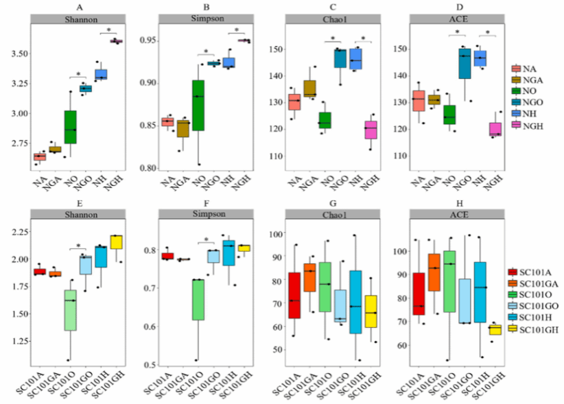 植物从土壤中招募与植物相关微生物,促进植物生长并减轻病原微生物对植物健康的不利影响。然而,微生物-植物互作减轻病原微生物对植物生长危害知之甚少。该研究通过建立S-微系统(即灭菌土壤生长的无菌黄花蒿、水稻或鱼腥草幼苗接种101种组合细菌(简称为101细菌))和N-微系统(自然土壤生长的无菌黄花蒿、水稻或鱼腥幼苗接种101细菌),评价定殖细菌群落减轻病原真菌G. ultimum对植物生长的危害。S-微系统和N-微系统分别接种和不接种G. ultimum处理后,调查其幼苗生长和细菌群落的丰度和组成。在黄花蒿、水稻和鱼腥草S-微系统中,接种G. ultimum的植株高度和根数分别较对照高34.5%和52.8%、23.1%和31.3%、102.1%和45.0%。在黄花蒿、水稻和鱼腥草S-微系统未接种G. ultimum的细菌群落多样性及丰度总体高于接种G. ulticum的系统(图 3)。根瘤菌属Rhizobium、假单胞菌属Pseudomonas、短壁单胞菌属Brevundimonas和杯状菌属Cupriavidus相对丰度与植物生长呈显著正相关(图 4)。