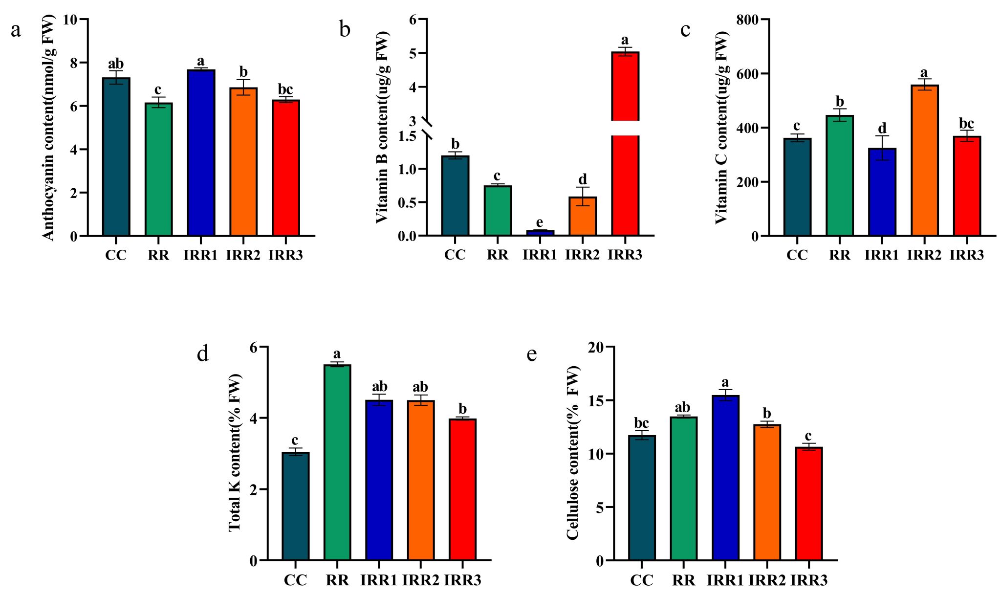 此外,本研究还发现部分萝卜的渗入系在营养品质,特别是花青素、维生素B、维生素C、钾离子和粗纤维方面有显著提升,这表明甘蓝遗传物质的渗入有效提升了萝卜的营养品质,为萝卜营养品质的遗传育种提供了新种质。