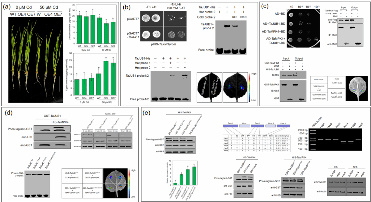 该研究发现,TaXIP3通过提高小麦根部木质素含量,减少镉由根部向地上部的转运。NAC型转录因子TaJUB1结合在TaXIP3的启动子上,调控TaXIP3的正向表达。随后,研究人员发现,TaMPK4能将TaJUB1磷酸化修饰,并提高镉胁迫下TaJUB1的蛋白丰度。最后,通过分析小麦种质材料中TaJUB1的单倍型,并鉴定到两个优异单倍型Hap4和Hap5,并创制了Hap4和Hap5的特异性分子标记,用于低镉小麦的分子标记辅助选择育种。