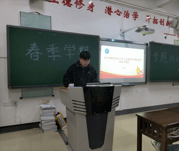 最后,张宇航同学就学生会改革发展向学生会成员提出五点建议与希望。第一,学生骨干要有坚定的政治方向,积极学习习近平新时代中国特色社会主义思想,并以之为指导。第二,要迎合时代发展,进行自我教育、自我管理、自我成长。第三,要明确自己的定位,发挥好桥梁纽带作用,连接学生与老师。第四,学生会要多与班长沟通,积极收集各班的意见,同时要多与校学生会及其他单位的学生会进行交流学习。第五,要为同学做实事,积极反映问题 、解决问题,落实到“小而实”的细节,真正做到为同学服务。