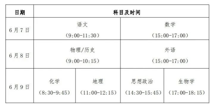考试时间安排在6月7日至9日。语文科目考试时长为150分钟,数学、外语科目考试时长为120分钟,选择性考试科目考试时长均为75分钟。具体考试时间为: