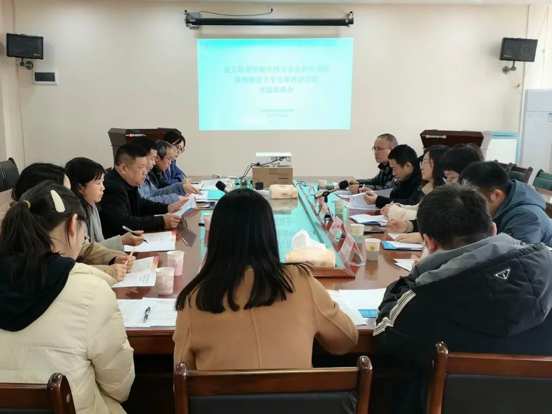 2024年3月6日下午14:30,遵义师范学院生物与农业科技学院院长隋常玲、党总支副书记方园、副院长尹明智、教师代表康奎和谢宇潇一行五人来到yl23455永利集团,与学院党委书记骆科建、副书记夏天、副院长彭涛和朱斌、各系科主任、师生代表进行交流座谈。座谈会由彭涛主持。