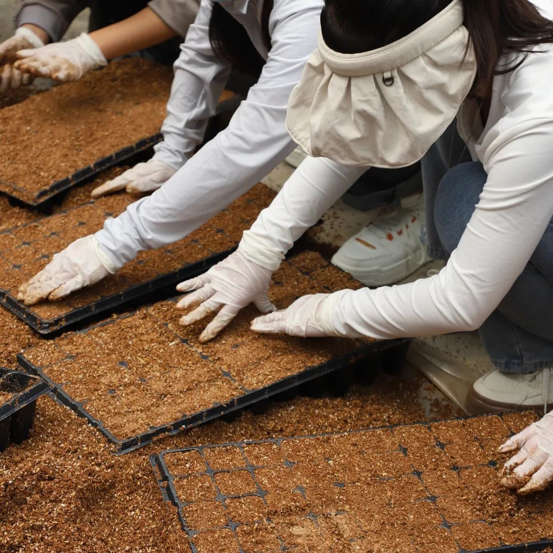 室外,由林科院研究员邓伦秀、陈志萍进行虎舌红瓶外生根实操,首先我们进行拌土,加入杀菌剂对混合基质进行消毒,接着将土分装入穴盘中,用力将土压平,接着邓伦秀研究员示范插苗的具体操作,将其技术毫无保留传授给学生。随即把处理好的虎舌红苗插入准备好的穴盘中,进行标签备注后,将其移入温室内,最后对苗进行农药喷洒,盖上透明塑料膜,虎舌红的插苗活动就落下帷幕。