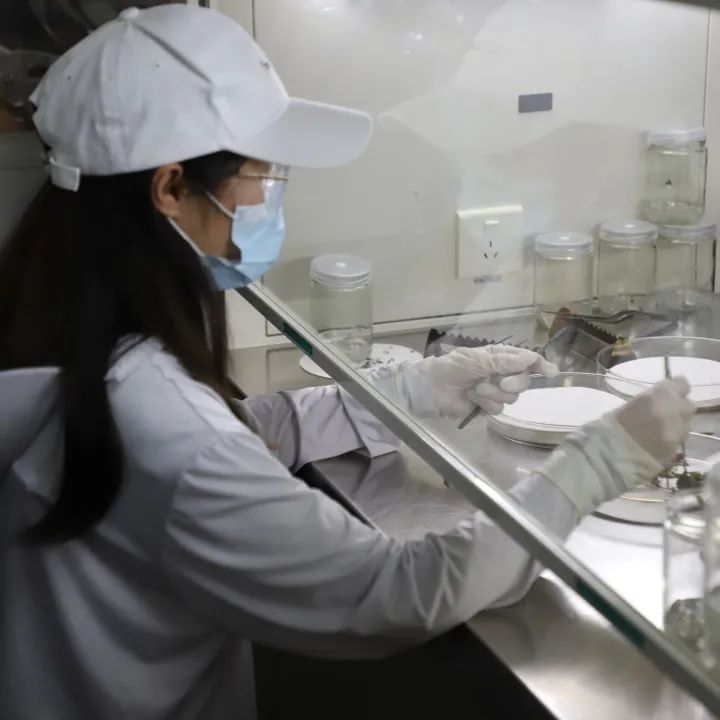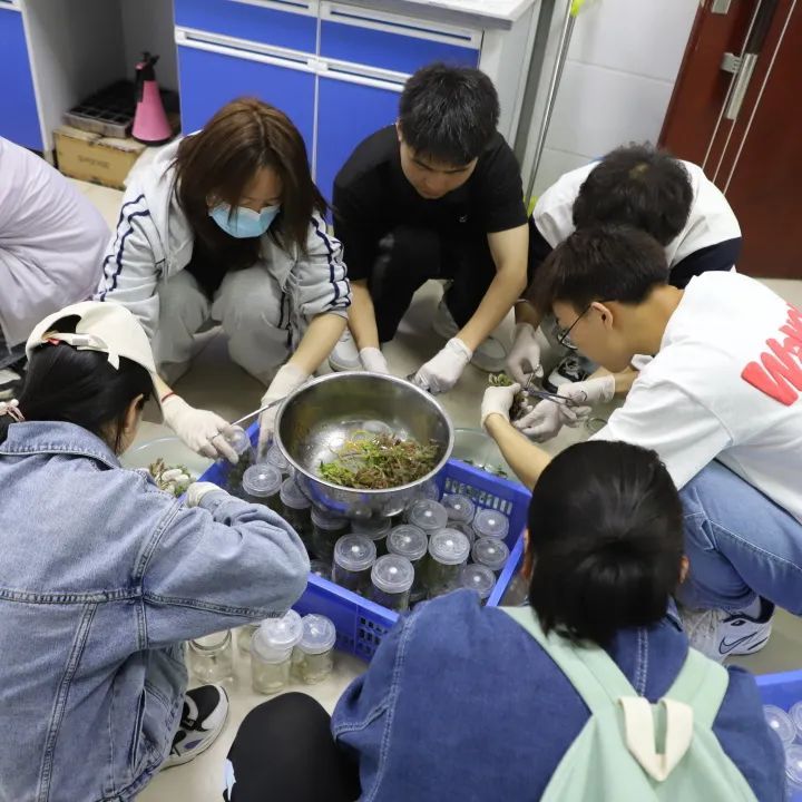 此次活动旨在紧密结合贵州省树木、花卉栽培和产业发展实际,通过“科研院所优势-高校实践教学”相结合的模式,促进学生相关专业知识和实践技能的培养。怀揣着喜悦的心情我们抵达林科院,刚踏入林科院,点点新绿映入眼帘,万物生机正蓬勃。起初,由林科院园林所所长李鹤对老师和同学们的到访表示热烈欢迎,介绍了参加此次实践指导活动的老师,并分配接下来的实践内容安排。主要活动内容有室内和室外,园艺班42名学生分成两组开展并交替进行。室内的在植物组织培养室进行,由林科院刘晓慧老师和龙海燕老师进行组培相关知识讲解、培养基配制和虎舌红组培苗转接实操。进入植物组织培养室后,刘晓慧老师开始讲解,演示培养基配制、灭菌、植物外植体消毒试剂的选择。其后,同学们戴好口罩、脚套、手套进入组培室中,感受实践打开的新世界大门!