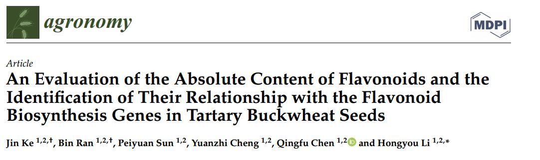评价苦荞种子中黄酮类成分的绝对含量和积累模式,了解黄酮类成分之间的积累关系,探讨苦荞种子中类黄酮成分含量与类黄酮生物合成基因表达的相关性,构建苦荞种子中主要类黄酮成分的生物合成途径,可以为苦荞种子中类黄酮成分及其生物合成的研究提供充足的理论依据,并在培育高类黄酮含量新品种方面具有潜在的应用前景。2023年12月7日,yl23455永利集团/贵州省荞麦工程技术研究中心,柯瑾等在Agronomy(中科院2区,IF=3.7)发表题为“An Evaluation of the Absolute Content of Flavonoids and the Identification of Their Relationship with the Flavonoid Biosynthesis Genes in Tartary Buckwheat Seeds”的研究论文。