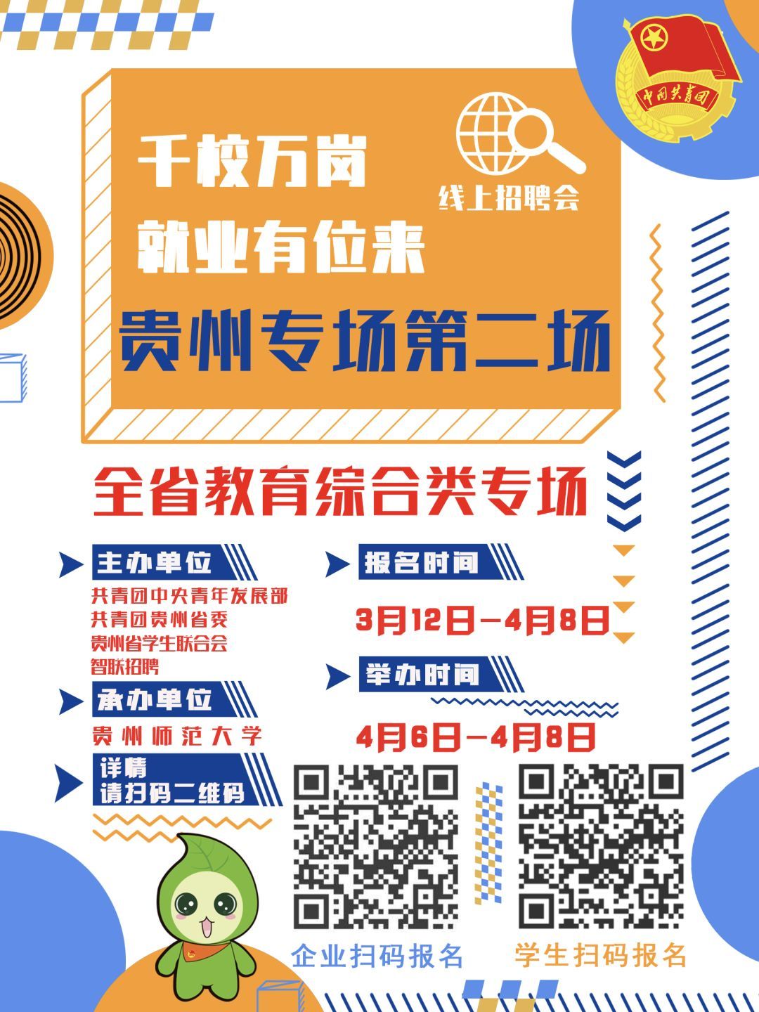 “千校万岗·就业有位来”线上就业服务贵州专场第二场空中双选会(全省教育综合类专场)将在2020年4月6日至8日和大家见面啦~