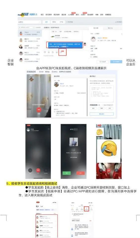 (3)招聘会当天PC端进入招聘会会场→单位登录→进入【学生大厅】,可查看所有报名场次简历,进行互动,开场当天可对已经投递/报名该场的学生,发起文字/视频沟通。更多人才需求可提前点击“去邀约面试”进入人才大厅邀约,邀约被同意后即可面试。视频挂断后,单位给出面试结果“合格”或者“不合格”,以及相关备注,以便后续查看。