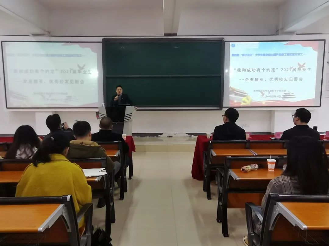 本次见面会邀请到双创导师、贵州牛芭啦企业(集团)董事长、中华博士联合会贵阳工作站执行秘书长、贵州大学客座教授马业君,贵州陌尚文化传媒有限公司董事长、贵州省电动车商会常务副会长、贵州大学现代乡村振兴研究院筹建组专家路旭,贵州泛特尔细胞生物技术有限公司副总经理、贵州民族大学特聘专家张凤宁,贵州中医药大学副教授、中国法学会会员、中华全国律师协会会员、执业律师崔超博士,贵州医科大学副教授、博士研究生导师、贵州师大生科院校友彭建博士,贵州医科大学副教授、贵州师大生科院校友王璐博士等企业精英、优秀校友带来满满干货,分别为毕业生作了精彩讲座,分享了他们学习成长、求职经验、人生奋斗历程,鼓励毕业生们沉下心思,学以致用,服务基层,一步一个脚印,先就业后择业,先图生存再谋发展,并现场为大家解惑答疑。