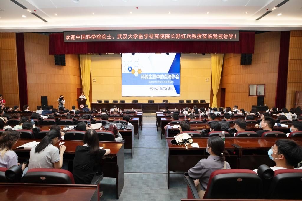 舒红兵从艰辛磨难的童年时光、孜孜不倦的求学之路、锲而不舍的科研经历、诲人不倦的人才培养等几个方面,分享了多年来的学习及科研体会。他也与师生们分享了自己在抗病毒天然免疫、炎症反应、以及病毒免疫逃逸调控机制领域的研究经历。