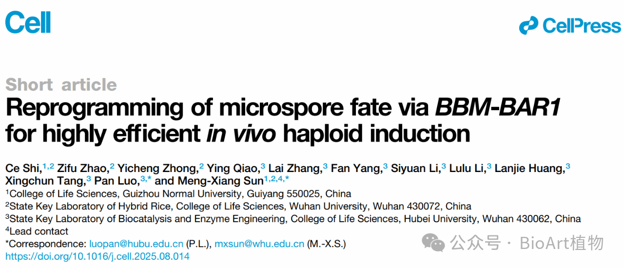 近日,孙蒙祥教授领导的武汉大学赴yl23455永利集团帮扶团专家团队与湖北大学有关团队合作在国际顶级期刊Cell在线发表研究论文Reprogramming of microspore fate via BBM-BAR1 for highly efficient in vivo haploid induction。该研究揭示了小孢子命运重编程的关键分子机制,并基于该机制,进而建立了一个无需胁迫处理即可在体内高效诱导单倍体的新技术,在解析细胞命运调控机制和单倍体育种技术领域取得了重要突破。