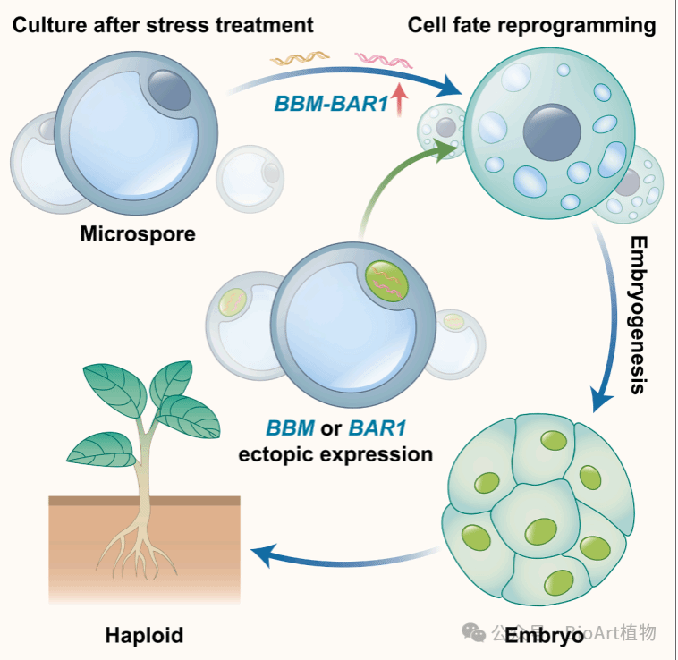 研究发现,在传统胁迫处理下,小孢子中会特异性诱导表达转录因子 BABY BOOM(BBM)。进一步实验表明,仅在烟草和水稻小孢子中异位表达 BBM 即可在无胁迫条件下诱导其命运转变和胚胎发生,说明 BBM 是胁迫诱导重编程中的关键调控因子。进一步研究鉴定出一个新的BBM下游作用因子BAR1(BBM-activated Androgenesis Regulator 1),其表达同样可独立启动小孢子的胚胎化进程,发挥与 BBM 类似的细胞命运重编程激活功能。