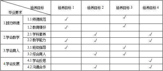 1.2 [教育情怀] 具有从教意愿,认同教师工作的意义和专业性,具有积极的情感、端正的态度、正确的价值观;具备人文底蕴和科学精神,尊重学生人格,富有爱心、责任心、事业心,工作细心、耐心,做学生锤炼品格、学习知识、创新思维、奉献祖国的引路人。