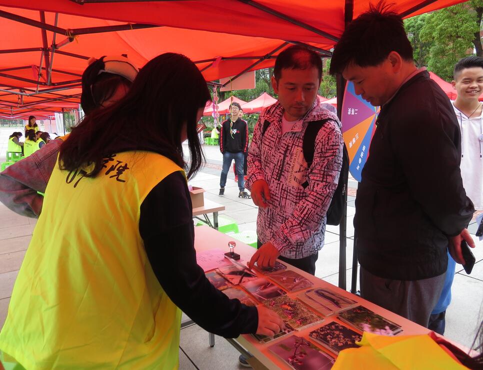 昆虫的口器什么样,鱼鳃的“丝”上有什么结构,长得像草鞋的小虫子是什么,这些平常难得一“见”的小东西,显微镜来帮你忙;洞穴生态系统中原来还有这么多特殊的小生物,它们对环境因子如此敏感,演化出很多适应性的特征;杜鹃花婀娜多姿,种子却十分细小,培植不易;制作中的动植物标本是什么样子,立体的植物是怎么“二维化”“贴”上平整台纸的,可以亲自动手来试试,把做好的植物标本画带回家,稍加修饰就是一幅小清新的装饰画哦;生态瓶里有一个个能够自己形成小循环的微型生态系统,里面的生物可都是活的哦;亲手制作漂亮的叶脉书签,了解植物叶片的结构,仔细刷洗这可是个耐心活……还可以给形态各异的Q版山地生物填色,做成小徽章随身携带;通过生物折纸了解生物的形态特征知识,亲手完成一个折纸生物纪念品。活动当天,在行政楼前开展的嘉年华活动丰富多彩,生科院师生以各种互动活动和实验体验向参与者宣传普及科学知识,让前来参与的大学城师生员工、来自师大贵安新区附小的百余名小学生等从不同的角度与层次加深了对山地生物多样性保护与生态文明相关知识的认识。